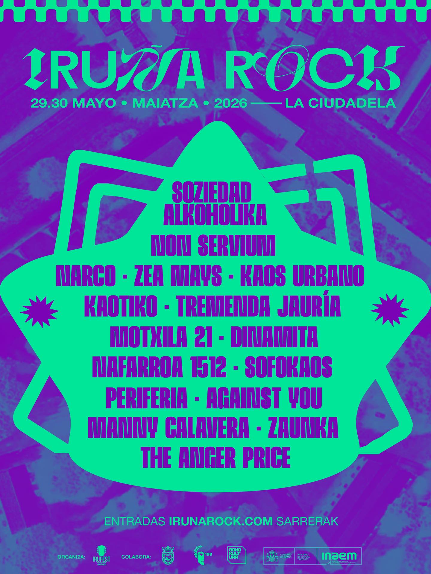 El Iruña Rock es uno de los festivales de música rock, punk y alternativa más destacados del norte, celebrado anualmente en Iruña (Nafarroa). Se define como un evento independiente, antifascista y comprometido con la cultura local. - Iruña Rock 2026: Fechas: Viernes 29 y sábado 30 de mayo de 2026. Lugar: Parque de la Ciudadela, Pamplona. Artistas Confirmados: Entre las bandas anunciadas se encuentran S.A. (Soziedad Alkoholika), Non Servium, Kaotiko, Zea Mays, Periferia y Tremenda Jauría. Entradas: Ya puedes adquirir los abonos a través de la plataforma oficial Enterticket. - Información de Interés: Web Oficial: irunarock.com para consultar actualizaciones del cartel y horarios. Entorno: Tras varias ediciones en el Navarra Arena, el festival ha regresado al recinto histórico de La Ciudadela, ofreciendo un ambiente al aire libre en el corazón de la ciudad. Servicios: El festival suele contar con sistemas de pulseras cashless para pagos dentro del recinto y opciones de viaje organizado a través de plataformas como Divertis en Vivo. ¿Necesitas ayuda para encontrar alojamiento cercano a la Ciudadela o quieres conocer el cartel completo por días?